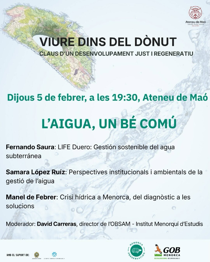 La primera taula rodona del cicle de l’Ateneu centrat aquest 2026 en el concepte de l’economia del dònut abordarà l’accés a l’aigua, un recurs essencial per a la vida però limitat, clau del sòl social i alhora sotmès a fortes pressions ambientals. En un context com el de Menorca, la sessió plantejarà com gestionar aquest bé comú de manera sostenible i amb criteris de governança compartida.