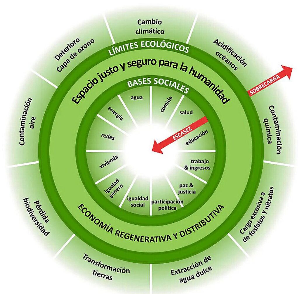 Això de les dimensions ho explica molt bé Kate Raworth, l’economista que ha redissenyat la teoria del creixement en base a la figura del donut o de la rosquilla. Ella ho il·lustra amb dos cercles concèntrics (d’aquí la similitud amb el donut). El cercle de dins simbolitza l’economia mínima, que ha de ser prou gran com perquè hi càpiguen els requisits per a la vida digna, mentre que el cercle exterior marca el límit de creixement, l’economia màxima, per no entrar en problemes seriosos.