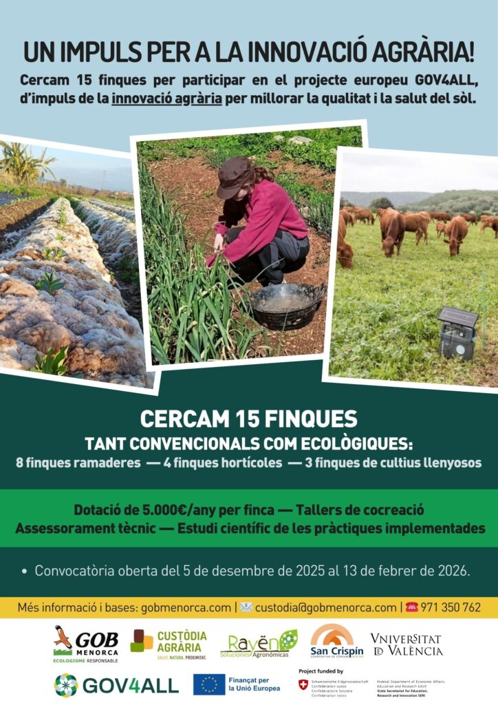 Ja ha estat publicat el formulari d’inscripció a la convocatòria del projecte europeu GOV4ALL d’innovació orientat a millorar la fertilitat i salut dels sòls a través de pràctiques sostenibles i innovadores. S’adreça a 15 finques de Menorca, tant convencionals com ecològiques. 8 finques ramaderes, 4 d’hortícoles i 3 de cultius llenyosos , que seran seleccionades per:
