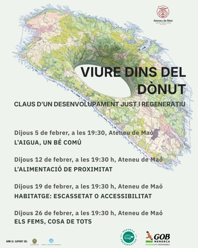 Organitzat per l’Ateneu de Maó, la Fundació Menorca Preservation i el GOB Menorca, el cicle plantejarà com garantir una vida digna per a totes les persones sense superar els límits ecològics, entre el límit del sostre ecològic (el que Menorca pot suportar) i el límit del sòl social (el mínim per viure dignament).
